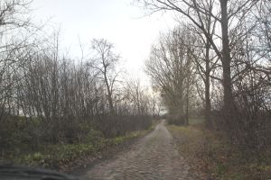 Żeby nie jechać przez Kętrzyn, wybraliśmy skróty przez Krzyżany, Gronowo, Wilkowo. Całkiem niezła asfaltowa droga po chwili się jednak skończyła. I trasę do Wilkowa pokonywaliśmy po pięknych acz niewygodnych kocich łbach, pamiętających chyba czasy sprzed I wojny światowej, kiedy to zostały ułożone. Tak jak je tam ułożono, tak odtąd ich nie ruszano…